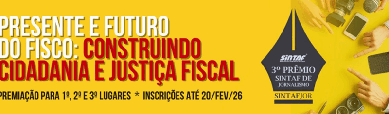 “Presente e futuro do fisco: construindo cidadania e justiça fiscal” é o tema do 3ª Prêmio Sintaf de Jornalismo (SintafJor), que está com inscrições abertas até o dia 20 de fevereiro de 2026 e distribuirá mais de R$ 40 mil em prêmios.