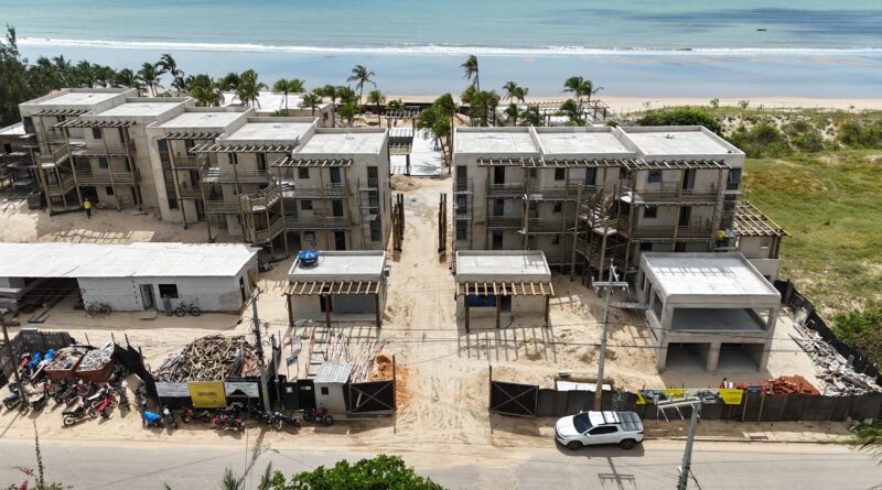 No litoral oeste do Ceará, a Brava avança com o Villa Carú, o maior condo-hotel de Icaraí de Amontada, atualmente em fase de acabamento e instalações externas. O empreendimento reúne 27 apartamentos — sendo 3 unidades 100% em madeira com vista para a baía — e 6 casas com piscina privativa, além de restaurante, deck, piscina, academia e guarderia. Com 6.618,61m² de terreno e 4.800,26m² de área construída, o projeto tem duração total de dois anos e sua arquitetura é assinada por Alejo Duarte.