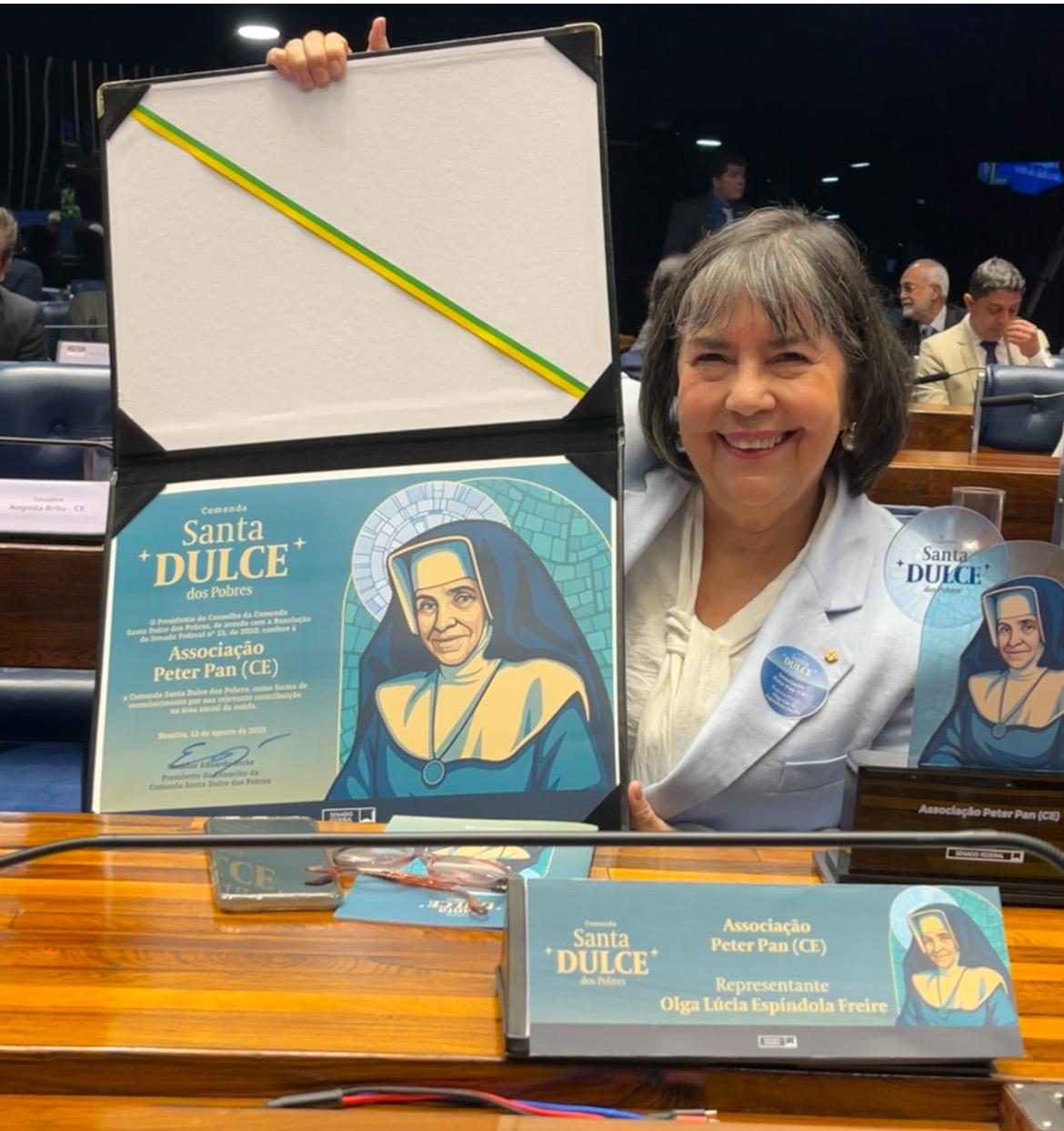 Na última terça-feira (12), a Associação Peter Pan viveu um momento especial ao receber, no Senado Federal, a Comenda Santa Dulce dos Pobres, honraria concedida anualmente a pessoas e instituições que prestam relevantes serviços na área da saúde. Na ocasião, Olga Freire, fundadora da instituição, representou toda a equipe na solenidade.