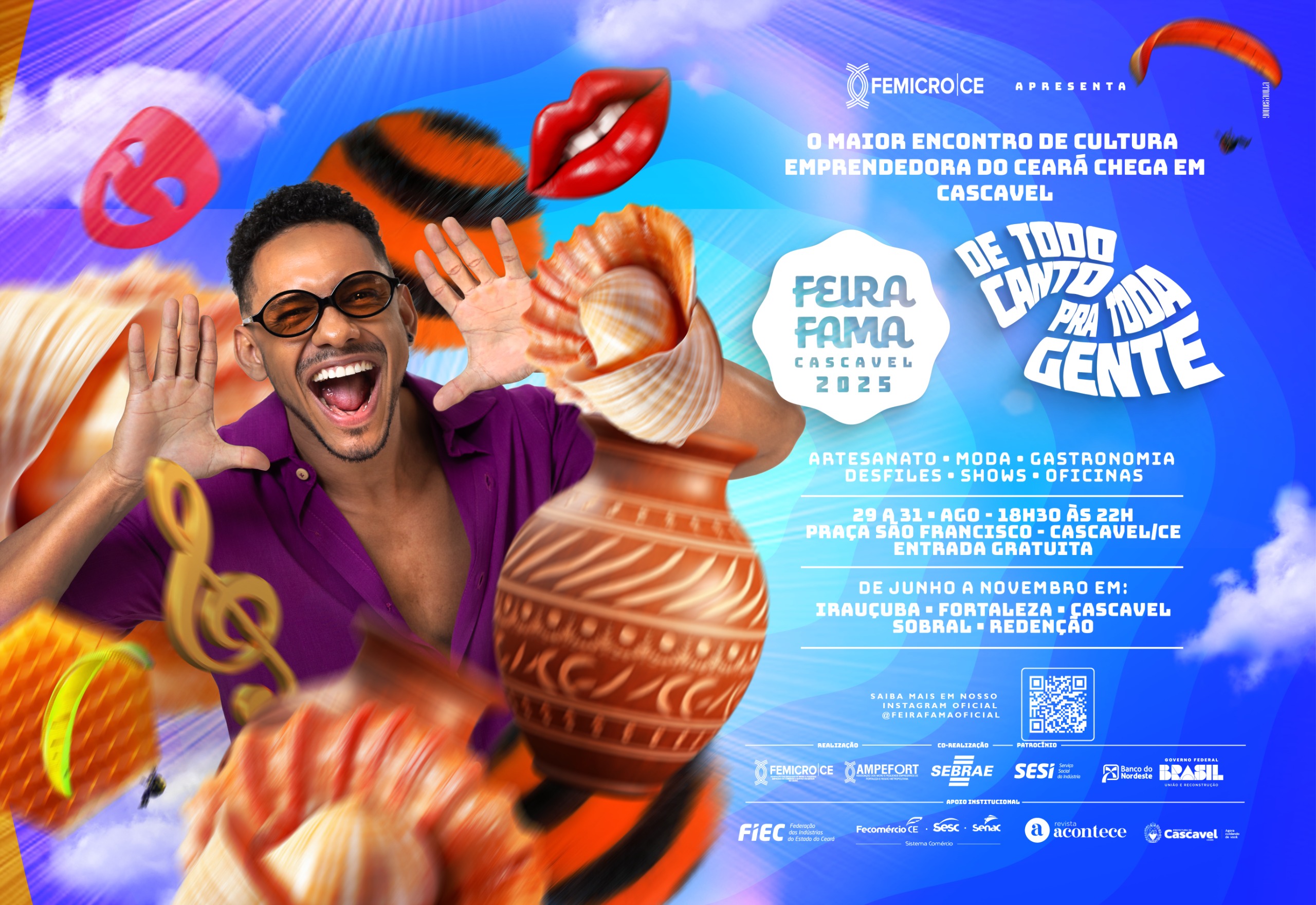 Com o tema “De todo canto pra toda gente”, a Feira Fama reúne centenas de expositores dos segmentos de artesanato, moda, gastronomia e agricultura familiar. O evento, realizado pela Femicro-CE em parceria com o Sebrae Ceará, conta com patrocínio do Banco do Nordeste e do SESI, além de apoio institucional da FIEC, Fecomércio-CE (SESC e SENAC), Revista Acontece e da Prefeitura Municipal de Cascavel.