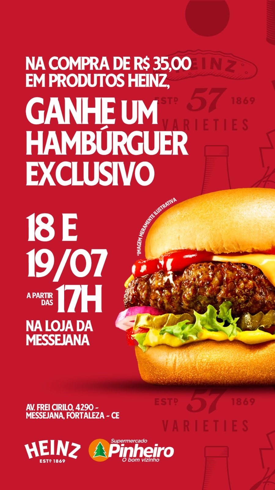 Na sexta (19) e sábado (20), a loja da Messejana receberá um food truck personalizado Heinz, que vai distribuir hambúrgueres exclusivos a partir das 17h. Para participar, basta comprar R$ 35,00 em produtos Heinz e garantir o brinde na hora. A ação reforça a parceria entre o Supermercado Pinheiro e a marca de condimentos mais lembrada do país, promovendo uma experiência direta com o consumidor.