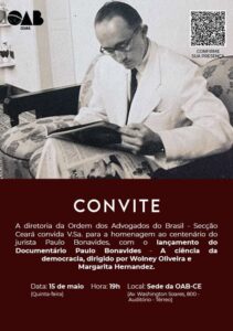 A Ordem dos Advogados do Brasil – Secção Ceará (OAB-CE) sedia, na próxima quinta-feira (15/05), o lançamento do documentário “Paulo Bonavides, a ciência da democracia”, dirigido por Wolney Oliveira e Margarita Hernandez. O evento será realizado às 19h no auditório da OAB Ceará.