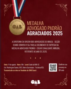 A Ordem dos Advogados do Brasil – Secção Ceará realiza, nesta quinta-feira (14/08), a cerimônia de entrega da Medalha Advogado Padrão 2025. A solenidade será no auditório da sede da OAB-CE, em Fortaleza.